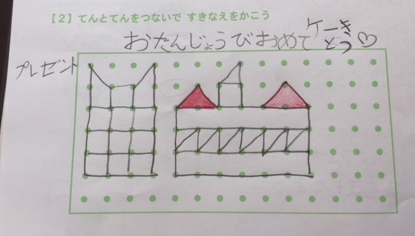 今日は恵先生のお誕生日と知り、小3のHさんがこんな絵を点をつないで描いてくれていました。